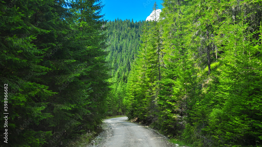 A gravel forestry road winding through green spruce and fir tree forests. Cindrel Mountains, Carpathia, Romania.