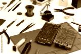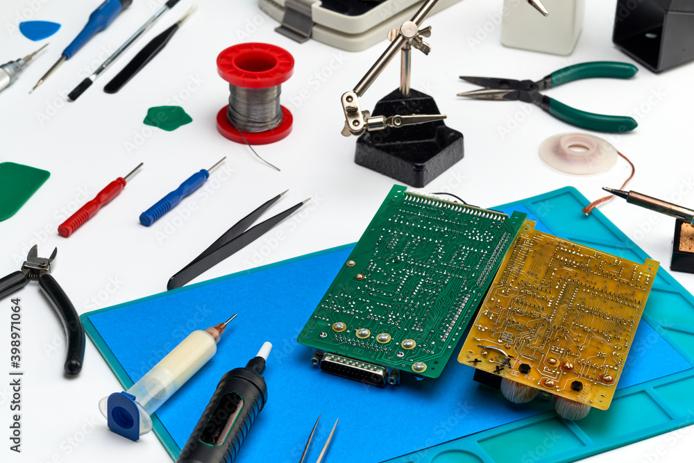 The master in the service center repairs the electronic unit.A soldering iron and a blow dryer heat the soldering parts.
