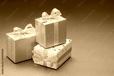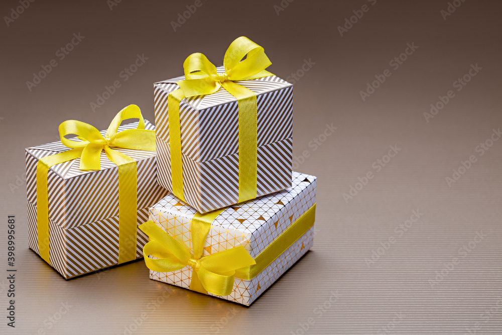 Gifts in shiny packaging for various holidays and events. Close-up, studio shot.