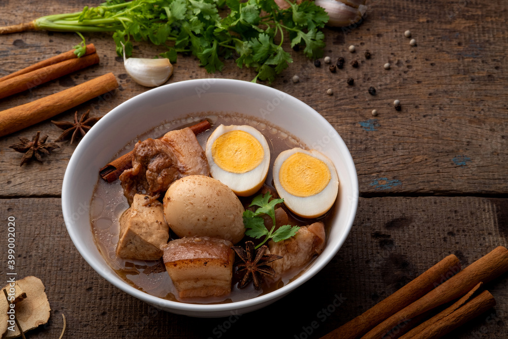 hard-boiled eggs in the sweet gravy sauce in white bowl.