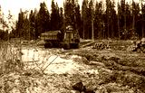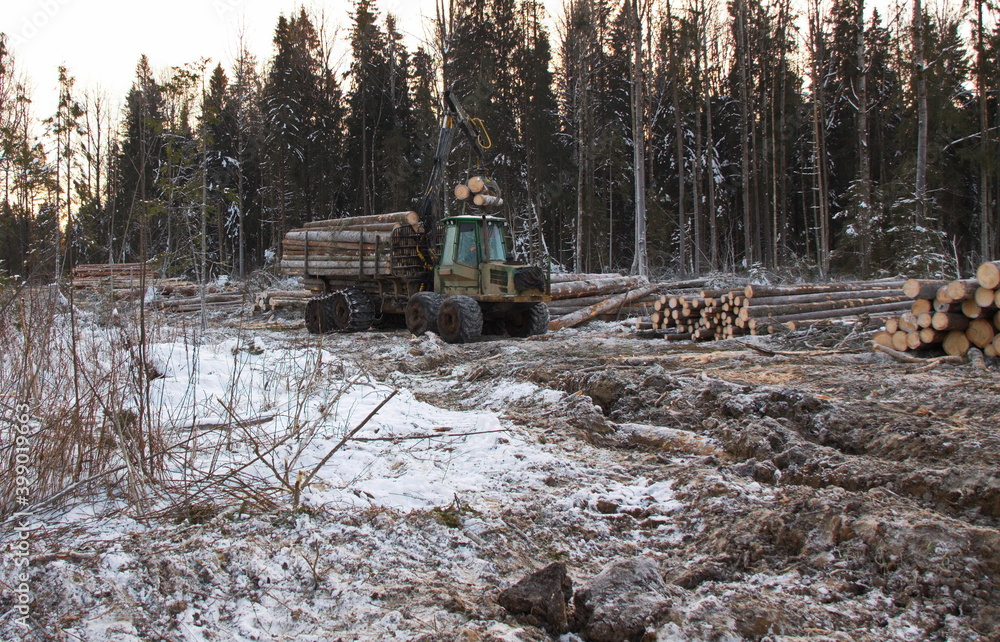 Wood harvesting in winter on the plot, equipment loaded with wood