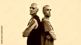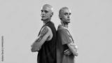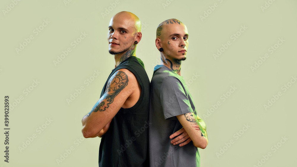 Portrait of two young men, twin brothers with tattoos and piercings looking at camera, posing together, standing back to back isolated over light green background