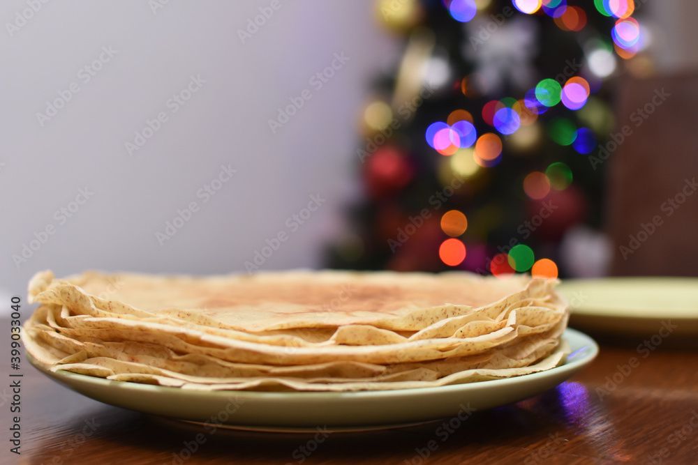 Stack of pancakes on table in front of Christmas tree. Pancakes with a Christmas light behind