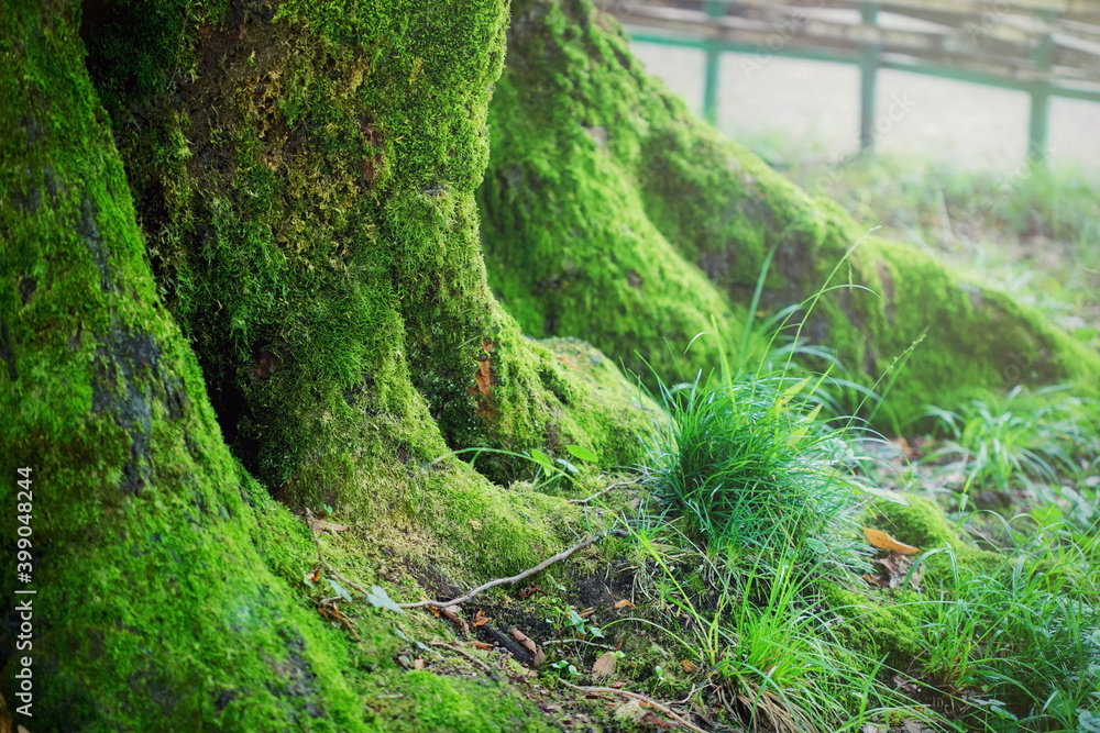 The very bottom of the trunk of a wide subtropical exotic tree