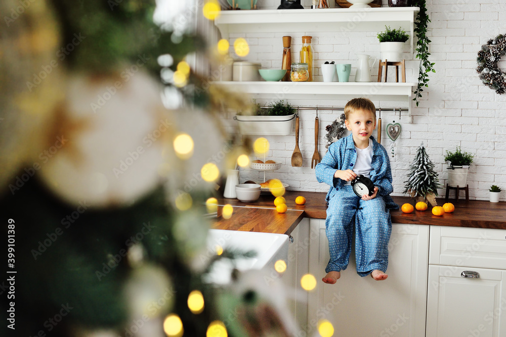 a small child boy in blue pajamas sits barefoot on a wooden table against the background of a modern white kitchen and Christmas lights on a Christmas tree holding an alarm clock.