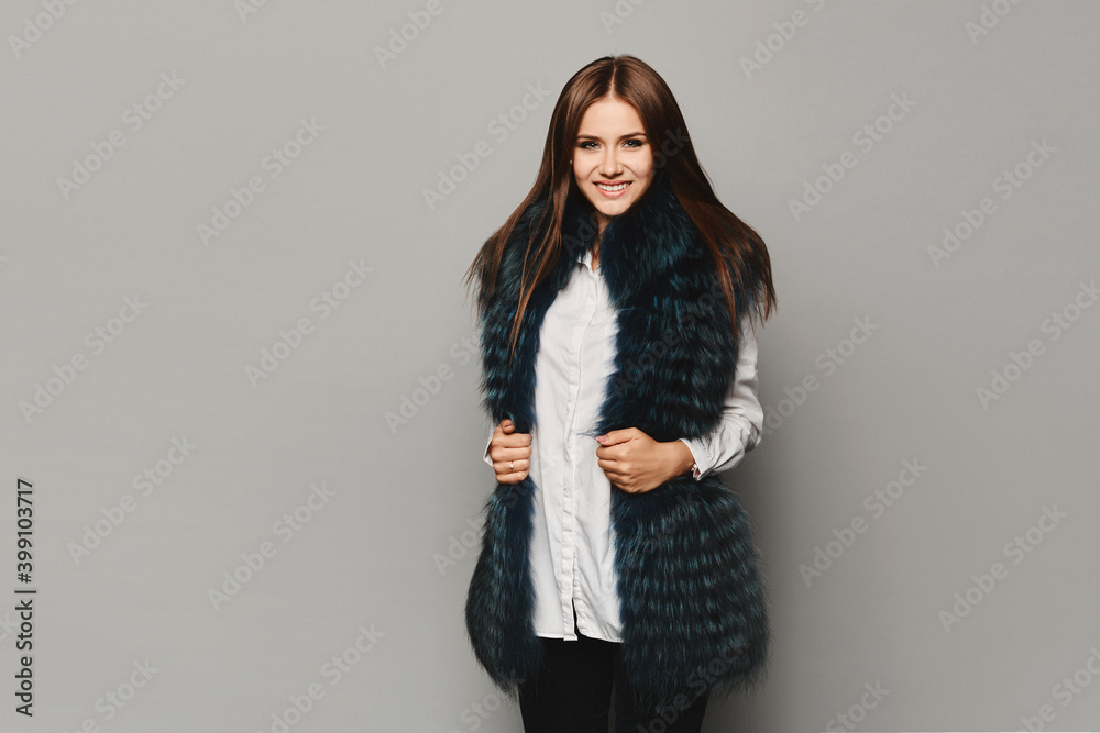 Smiling model girl in winter fur vest posing on the grey background, isolated. Winter fashion