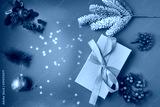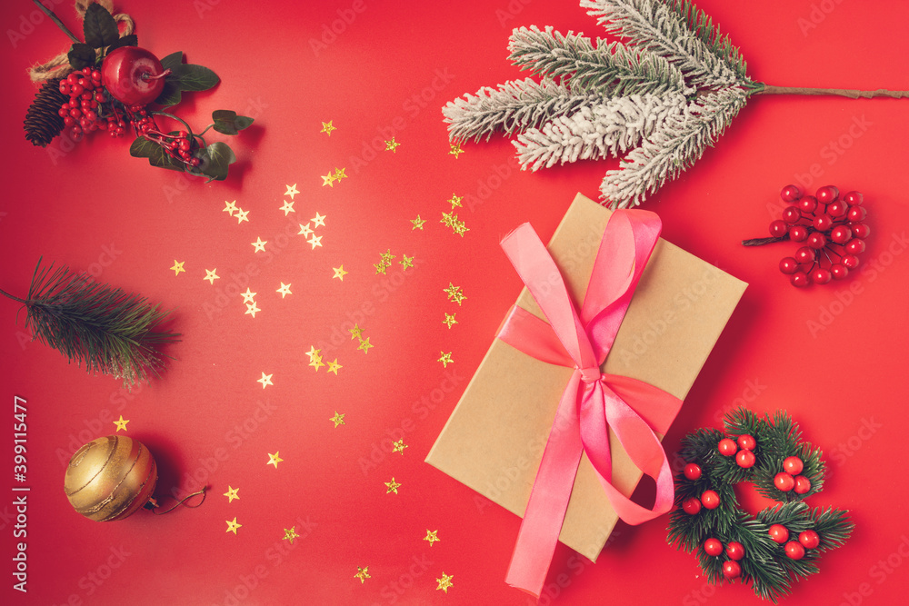 Festive Christmas and new year decorations with gift box,balls, cones on red background.
