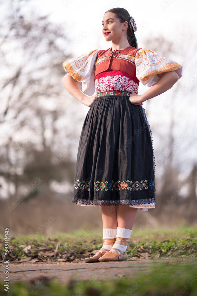 Young beautiful slovak woman in traditional dress. Slovak folklore