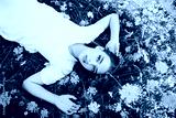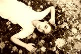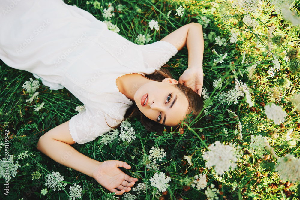 Fashion portrait of young woman lying on fresh green grass, wearing vintage small white dress