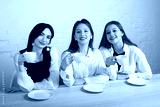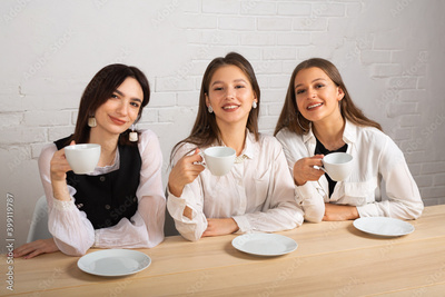 three beautiful young women with mugs in a restaurant