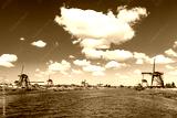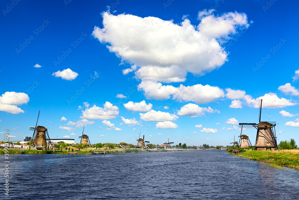 Famous windmills in Kinderdijk village in Netherlands. Colorful spring rural landscape. UNESCO World Heritage and famous tourist site.