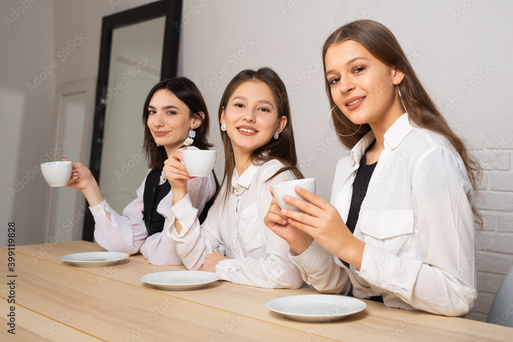 three beautiful young women with mugs in a restaurant