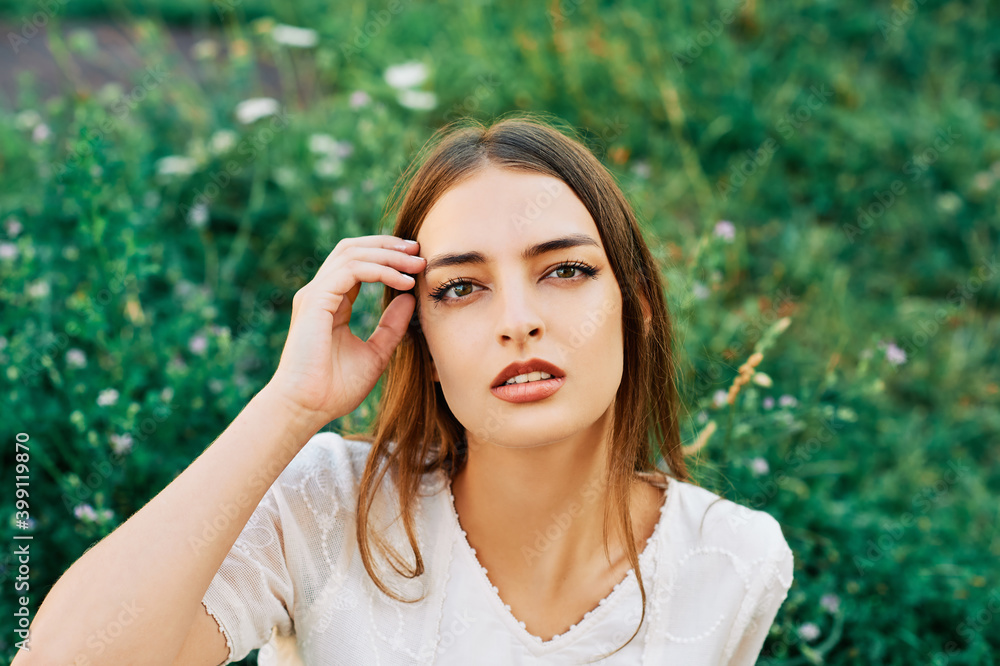 Fashion portrait of young woman resting on fresh green grass, wearing white dress