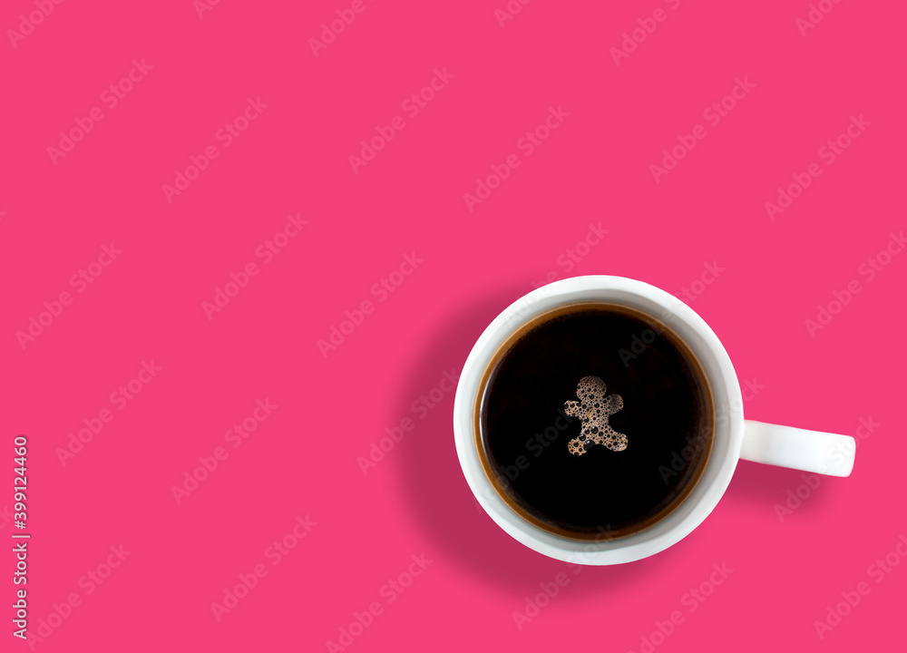 Creative concept with cup of coffee and gingerbread man cookie made of coffee foam. Flat lay design