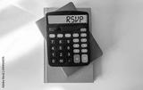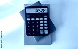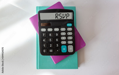 Calculator with text RSVP on display. Notepads lie on a white background. Place for text