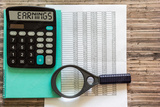 Earning text word on calculator and wooden background. Magnifier and notebook and documents lie side by side