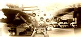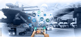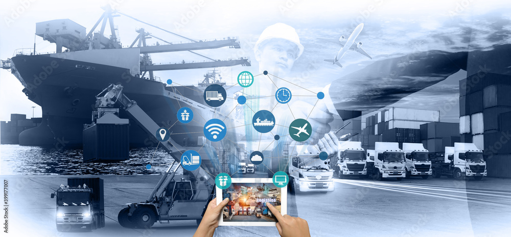 Hand holding tablet is pressing button on touch screen interface in front Logistics Industrial Container Cargo freight ship for Concept of fast or instant shipping, Online goods orders worldwide