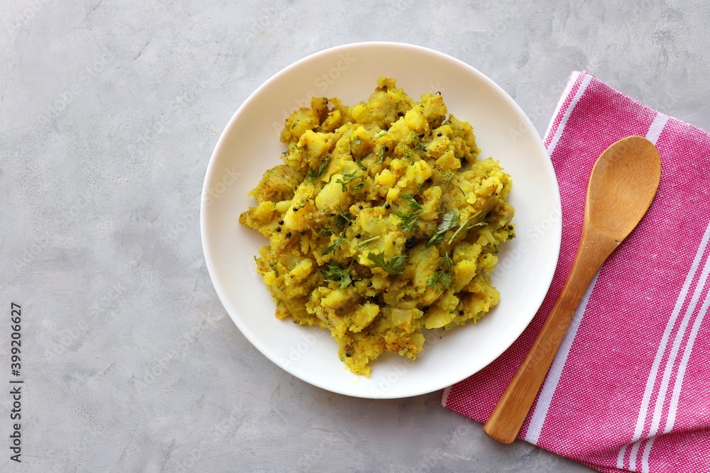 Indian boiled mashed potatoes curry or sabzi. Alu ki sukhi sabzi. Also known as Batatyachi suki bhaji in Marathi. ideal for puri bhaji or vada pav.