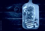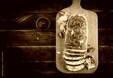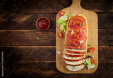 Tasty homemade ground baked turkey meatloaf with corn and slices pumpkin on wooden table. Food american meat loaf. Top view, overhead