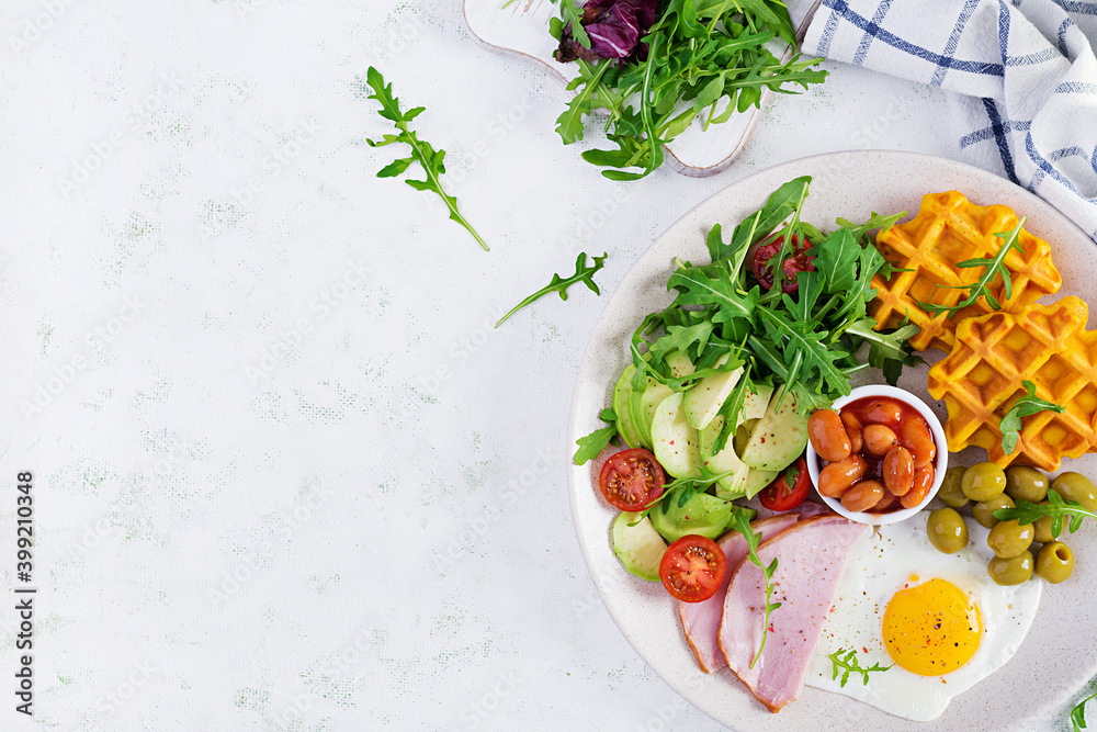 Breakfast with pumpkin waffles, fried egg, ham, tomato, avocado, beans and olives on white background. Appetizers, snack, brunch. Healthy food. Top view, overhead, copy space