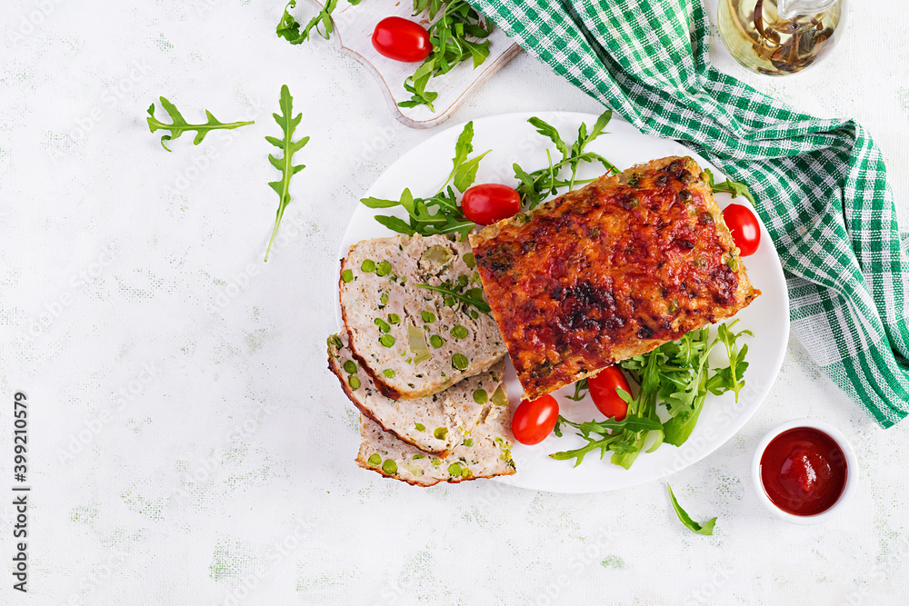 Tasty homemade ground baked chicken meatloaf with green peas and sliced broccoli on white table. Food american meat loaf. Top view, overhead, flat lay