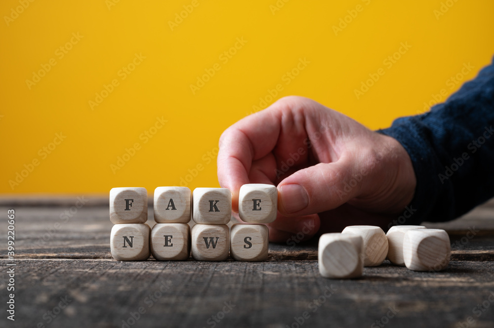 Assembling wooden cubes to spell Fake news sign
