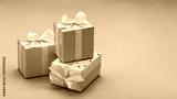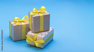 Souvenirs and gifts for dear people in elegant packaging for different holidays. Copy space, blue background.