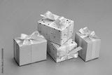 A set of gift boxes in an elegant package with ribbons and bows. Blue background, copy space.