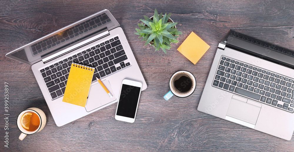 Working from home. Two laptops and tea coffee mugs on wooden rustic desk. remote working or studying. Working space at home or distance learning banner or lockdown lifestyle. top view