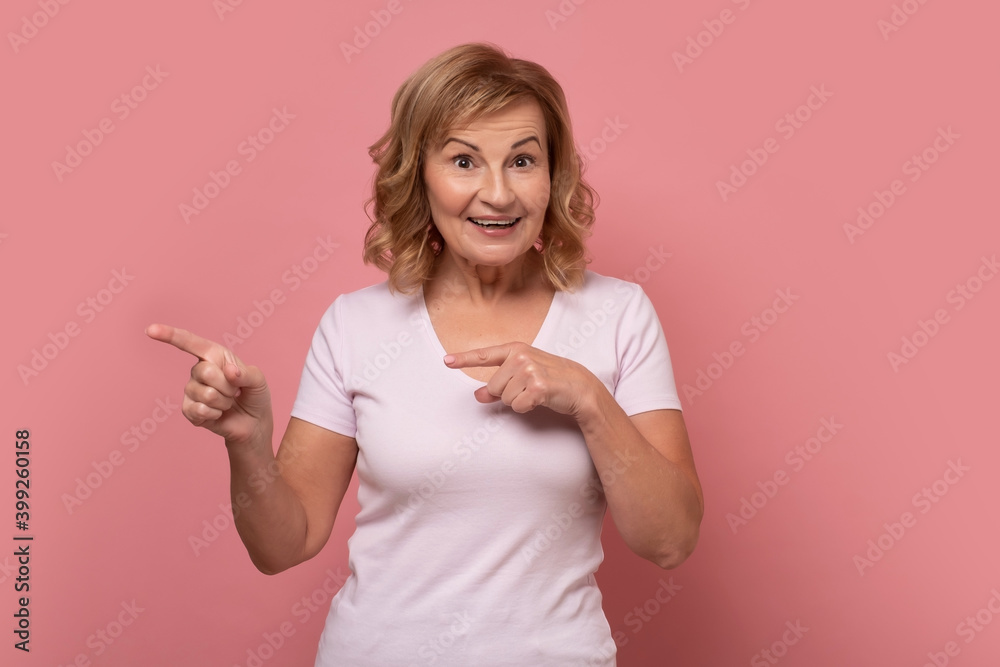 Senior woman smiling cheerfully and pointing with forefingers away, indicating copy space