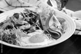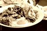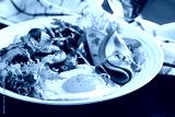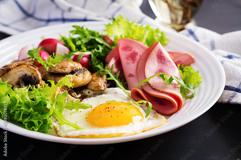 English breakfast - fried eggs, ham, fried mushrooms, radish and arugula. ketogenic, keto food.