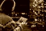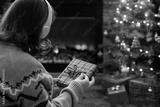 Woman in headphones with christmas gift box in hand sitting on fluffy plaid near fireplace and christmas tree.