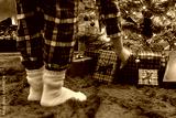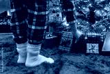 Woman in pajama and winter socks putting gift box under christmas tree. Presents for family.
