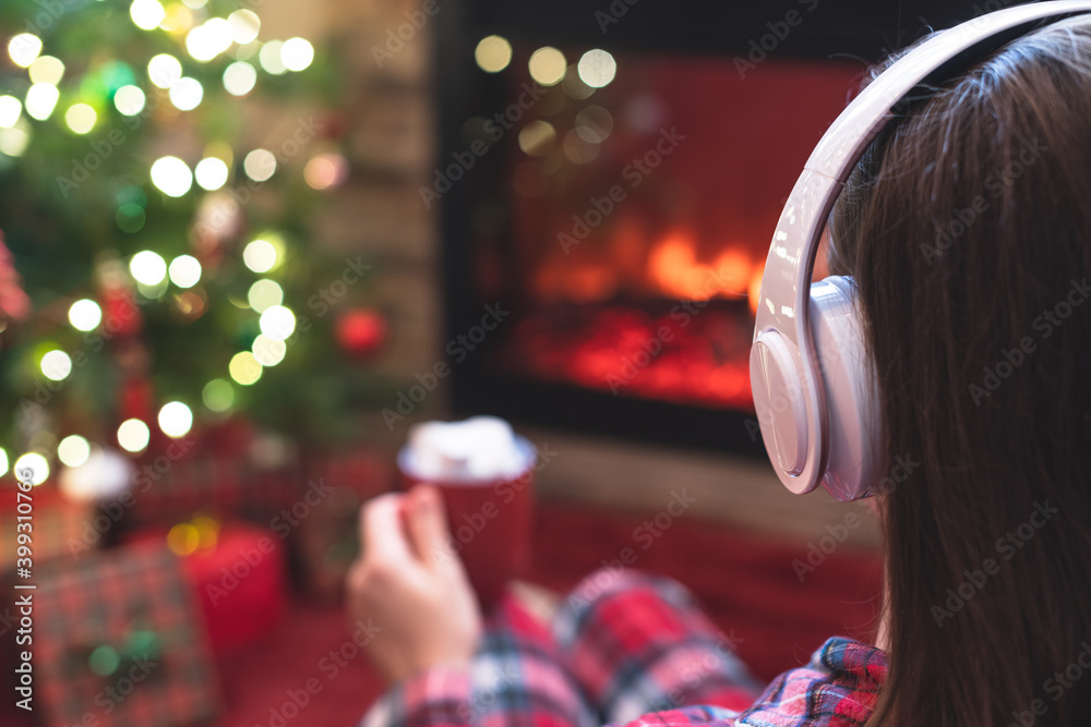Woman in pajama in headphones with cup of hot cocoa and marshmallow sitting and warming at winter evening near fireplace flame and christmas tree.