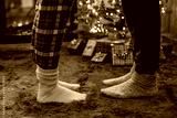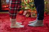 Woman feet standing in tip toe in winter socks on male lags on a fluffy red blanket near a Christmas tree with gifts. Concept