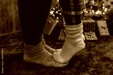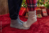 Woman feet standing in tip toe in winter socks on male lags on a fluffy red blanket near a Christmas tree with gifts. Concept