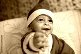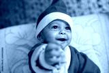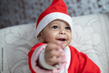 Portrait of Baby smiling in Santa costume with tree in background