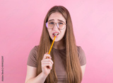 Portrait of thoughtful girl having pencil in mouth, looking to camera isolated on pink background.