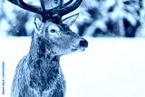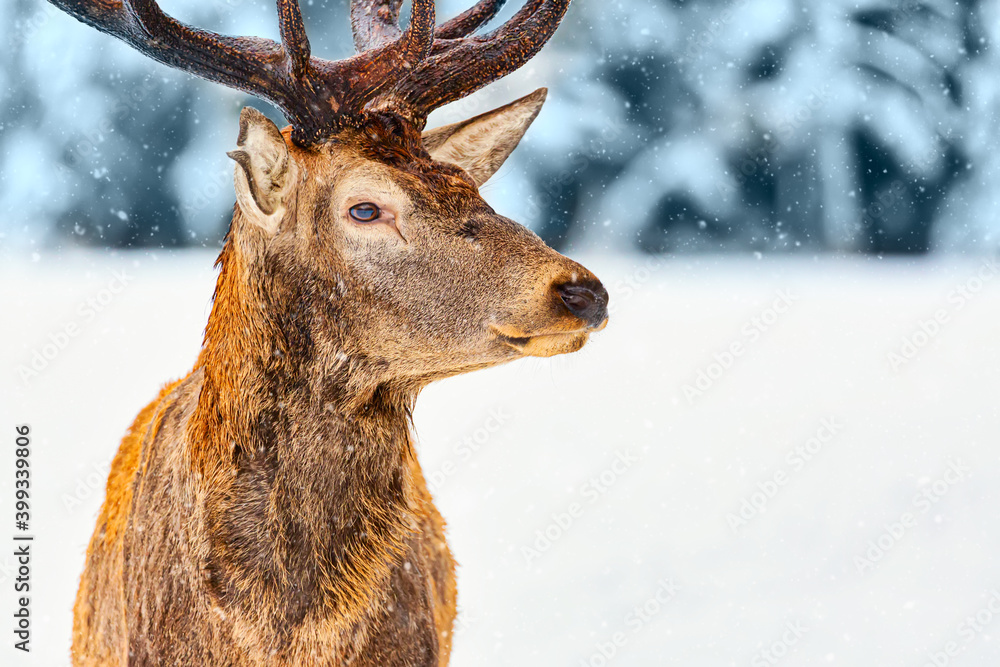 Close up portrait of noble deer against winter forest with snow in Rovaniemi, Lapland, Finland. Christmas winter image