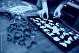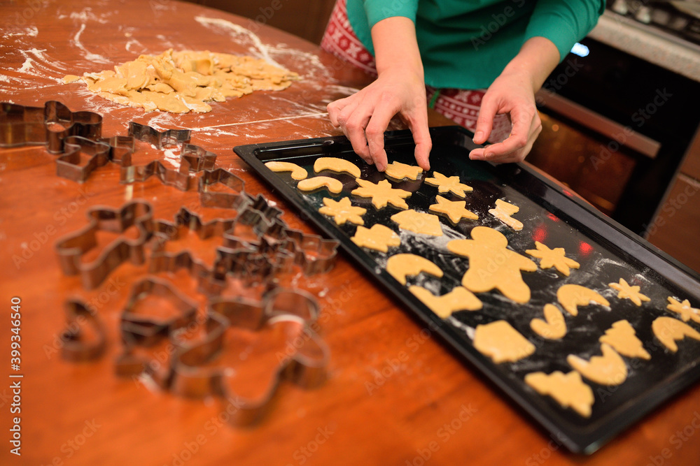 hands close up spread raw gingerbread on a baking sheet against the background of the oven and kitchen
