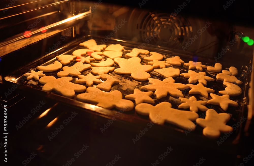 gingerbread cakes of different shapes in a baking tray are baked in the oven close-up.