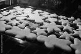 gingerbread cakes of different shapes in a baking tray are baked in the oven close-up.