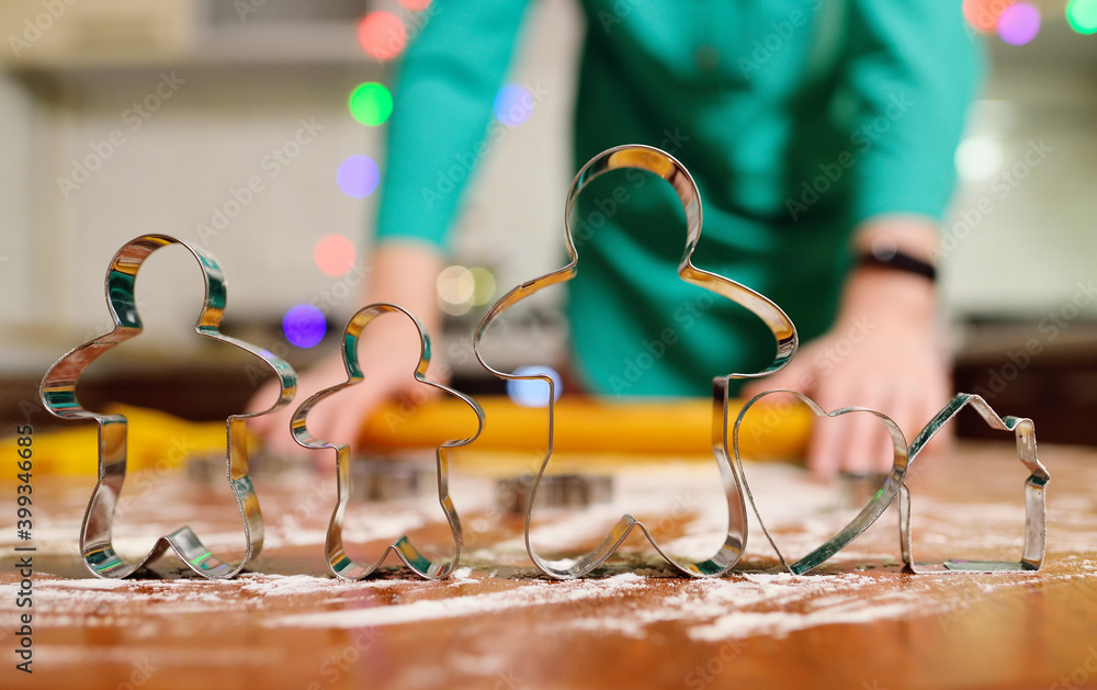 women's hands roll out the dough against the background of iron figures of forms for baking gingerbread close-up.