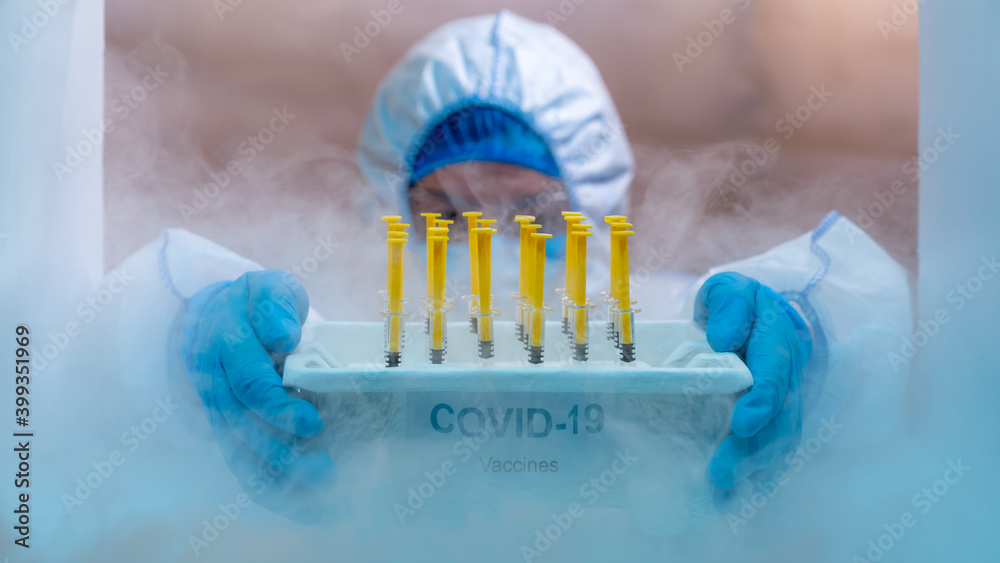 Medical staff distributing covid-19 vaccine tray inside the freezer. Healthcare and medical concept