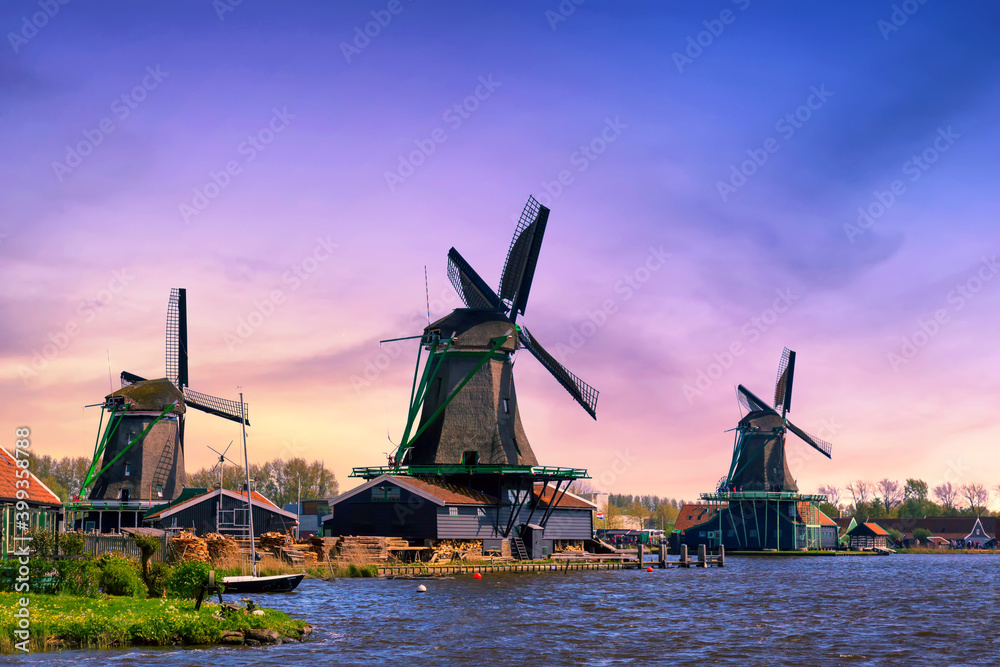 Netherlands rural landscape. Traditional Dutch windmills with canal in Zaanse Schans village during sunset.