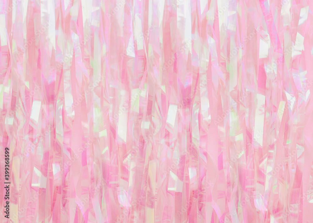 Tinsel pattern Close up photo for posters and banners Bright shiny pink decorative paper for party and festivals background