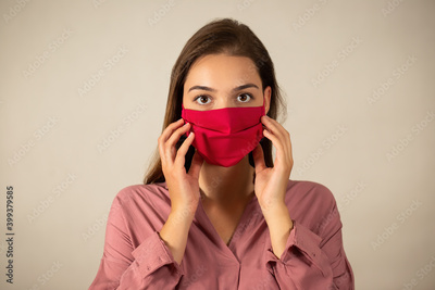 Young woman touching red mask on the face in studio. Girl with brown hair wearing textile respiratory like preventions against virus. Brunette female with covered mouth looking to the camera.