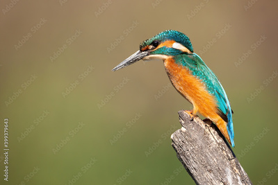 Common kingfisher, alcedo atthis,sitting on tree in summer nature. Bird with colorful body resting on stump with copyspace. Feathered animal looking from branch.