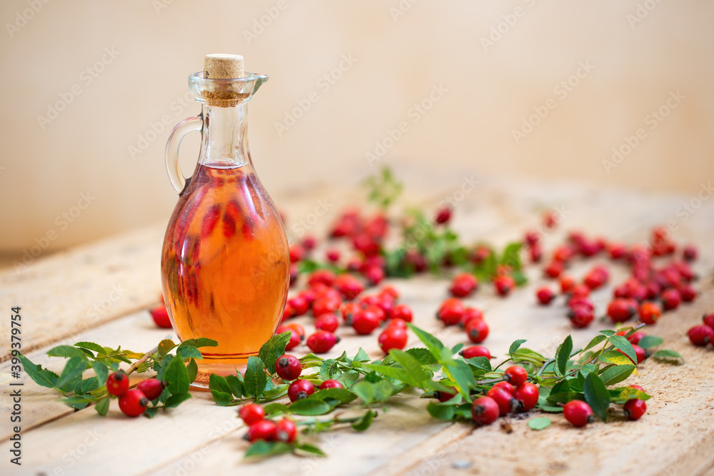 Bottle of rosehip oil laid on wooden table with berries around. cork horizontal. Glass with cork plug full of red oily fluid on brown palette. Vitamin healthy liquid ingredient.