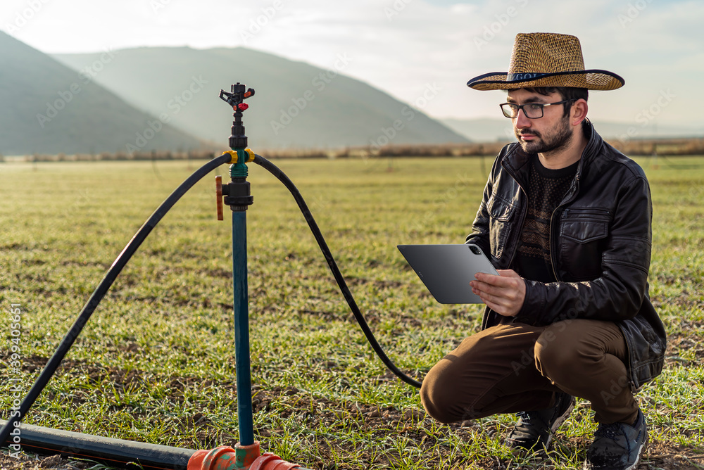 Smart farming agriculture concept. Man hands holding tablet on blurred organic farm as background. Smart irrigation technology. american farmer concept
